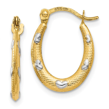 14K Rhodium Textured Hollow Oval w/ Hearts Hoop Earrings