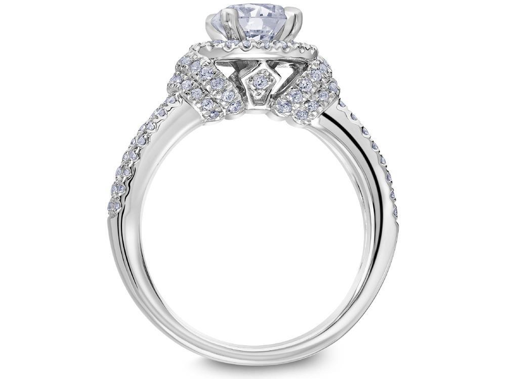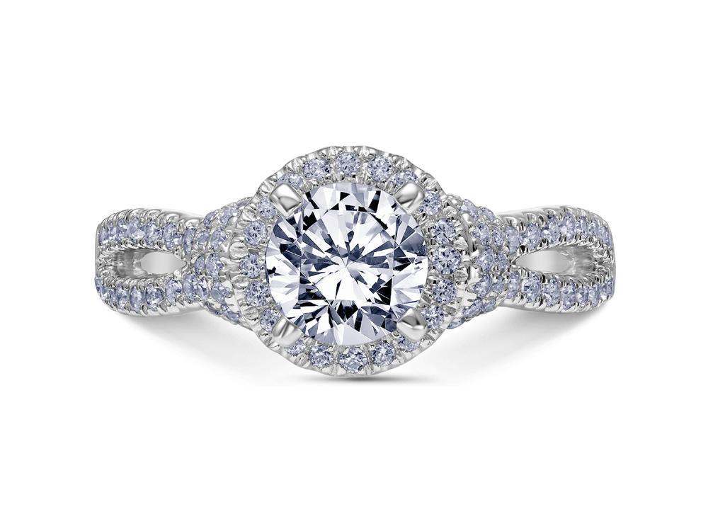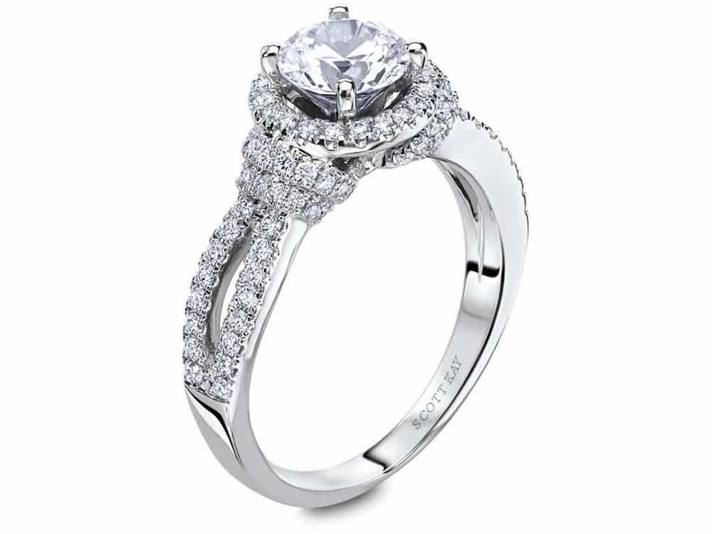 Introducing the Scott Kay Luminaire Women's Diamond Engagement Ring, featuring a stunning split shank mounting with double diamond shoulders and a halo design. This elegant ring showcases a round diamond halo and diamond split shank with accent bars, totaling 0.53ct in diamond weight. Center stone not included.